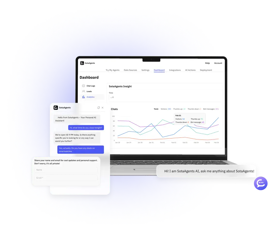 Feed data from diverse sources, fine tune your AI SotaAgents, and facilitate user engagement everywhere.